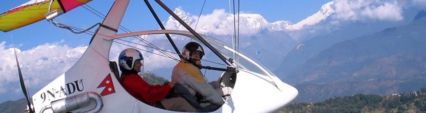 Ultralight aircraft is an ideal way to view the panoramic Himalayan range right in front of your eye Flights takes off from the Pokhara Airport and are operated almost throughout the year except during the monsoon (June through August). Flights take place from sunrise to 11 am and from 3 pm to sunset every day, provided there is no rainfall. During the half an hour flight, one flies over Pokhara city, Phewa Lake, Sarangkot Hill and gets close to the Machhapuchhre Mountain. Another option is to explore the Annapurna range from 12,000 feet or higher in an hour.